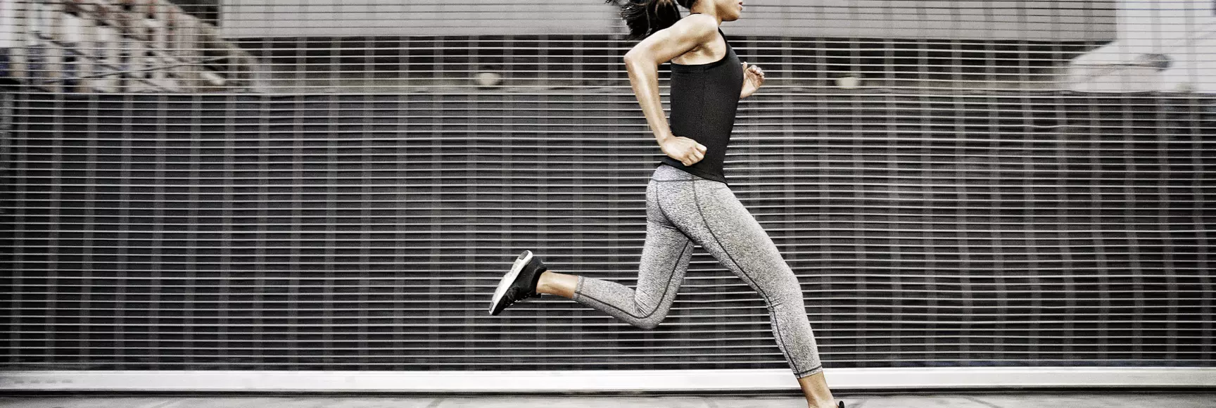 Woman running wearing stretch activewear made with LYCRA® SPORT PCE™ Fabrics – Because comfort and performance matter™.